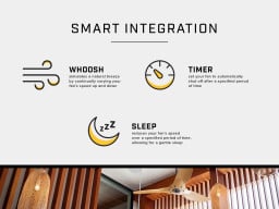 Control via handheld remote, mobile app, or voice with Apple HomeKit (Matter), Amazon Alexa, and Google Home. Whoosh mode simulates natural breeze. Fan Eco mode optimizes efficiency.