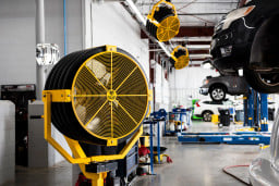 30" directional fan with heavy-gauge steel frame, IPX5-rated motor, and ½-hp permanent-magnet drive. 10 speed settings, 360° vertical rotation, portable pedestal base.